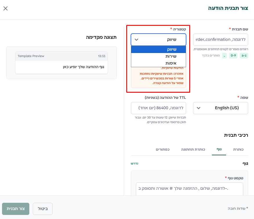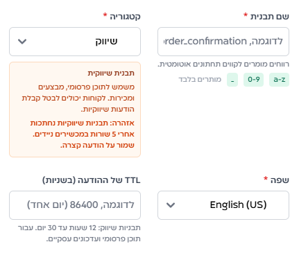- שפת תבנית – השפה שבה יוצג תוכן ההודעה.