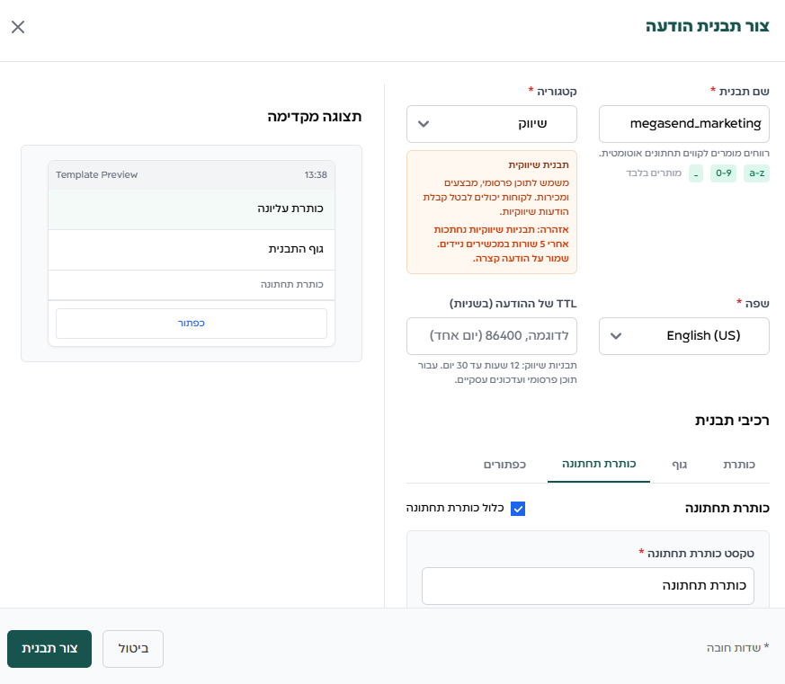 - התבנית יכולה לכלול טקסט שיווקי וכפתורים בלבד.