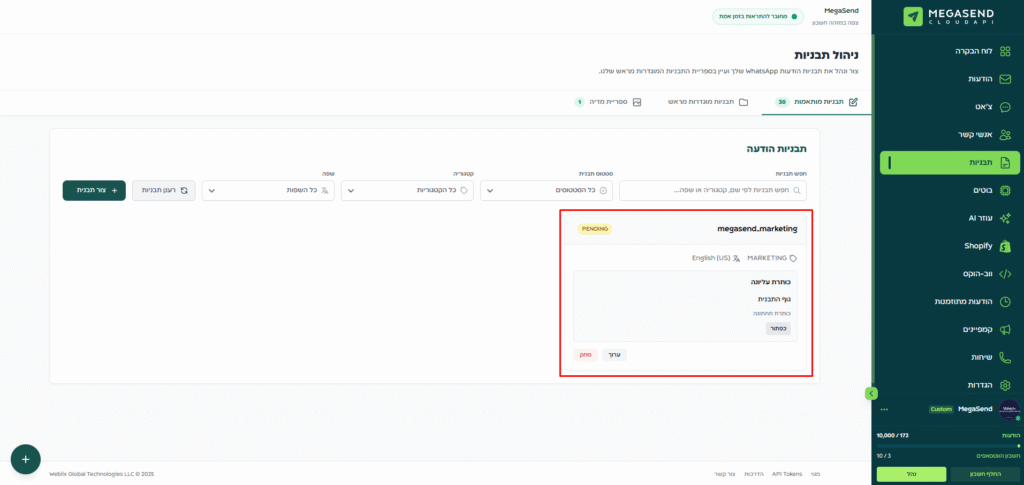 - אישור התבנית נעשה על ידי Meta בלבד ויכול לקחת מספר שניות עד כמה שעות.