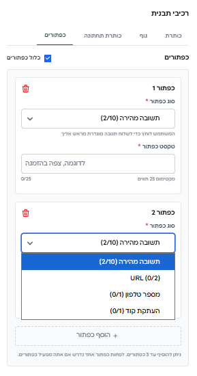 - URL (הגבלה עד 2 להודעה) – כפתור שהוא קישור משמש לדוגמא “מעבר לאתר” בלחיצה אתר העסק ייפתח ללקוח
