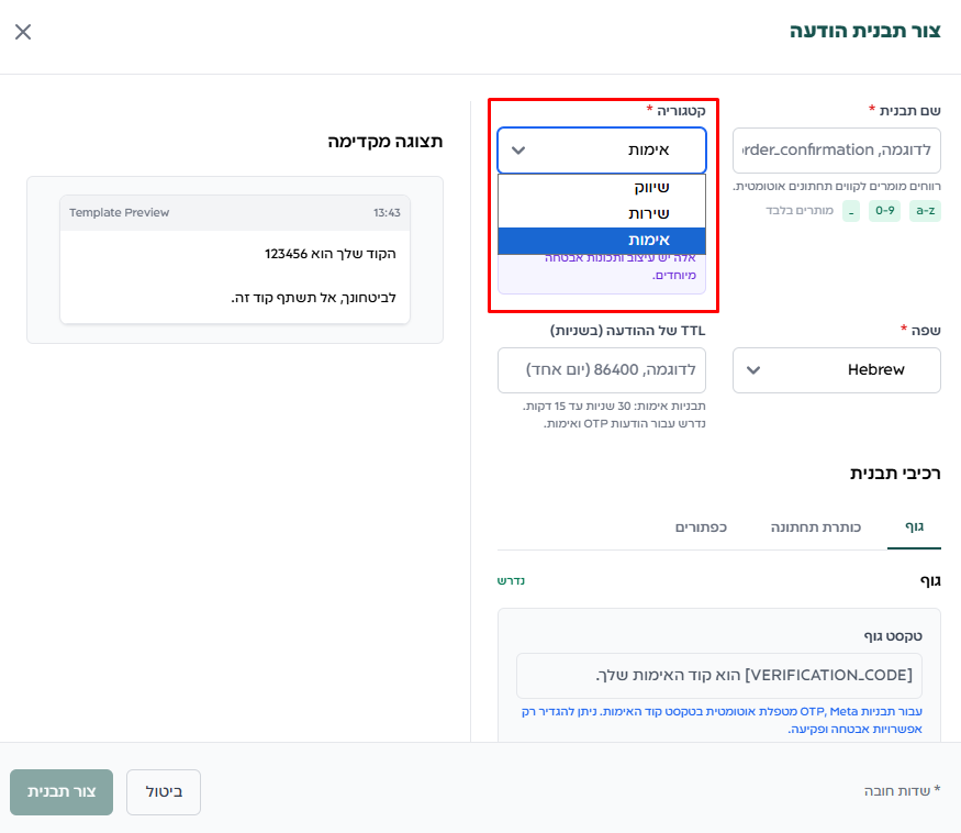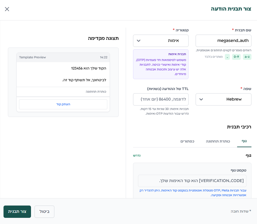 נבחר באופציה "יצירת תבנית חדשה" ונגדיר את הקטגוריה של התבנית ל‑אימות (Authentication).