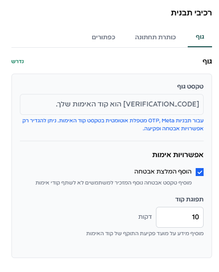 מכיל את תוכן ההודעה שתוצג. בתבנית אימות התוכן קבוע מראש ולא ניתן לשינוי.