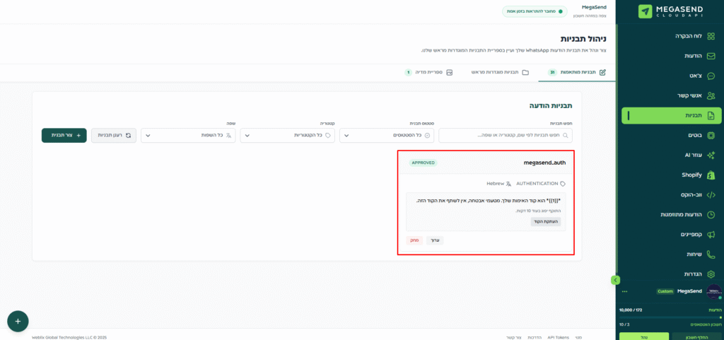 ראשית ניגש לקטגוריית התבניות בממשק MegaSend כדי להתחיל ביצירת תבנית אימות חדשה.