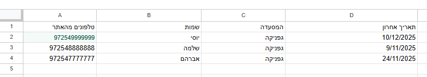 אני רוצה לשלוח הודעה שבה מופיעים שם הלקוח, הסניף האחרון שביקר בו והתאריך — ולכן הקובץ יכיל את כל העמודות האלה.