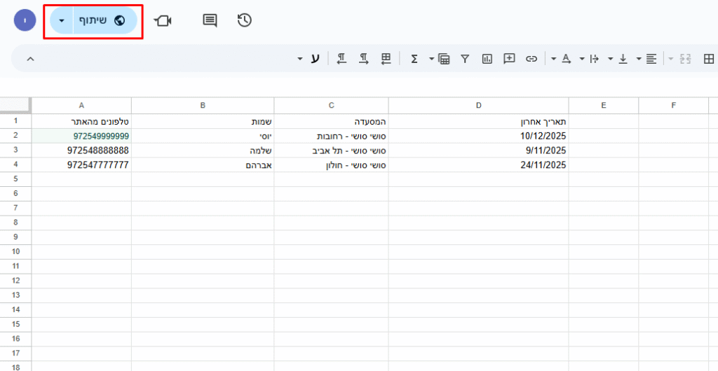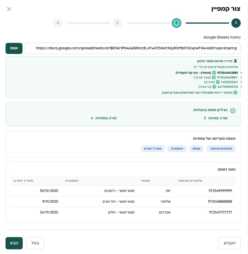 מעלים למערכת קובץ Google Sheets שמכיל גם את מספרי הטלפון וגם את הנתונים עבור כל משתנה — וכל לקוח מקבל הודעה שמרגישה אישית, למשל: