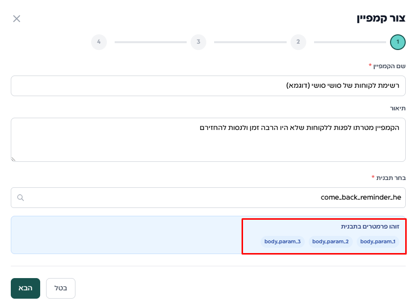 אם התבנית דורשת פרמטרים — המערכת תזהה ותציג אותם בצורה ברורה.